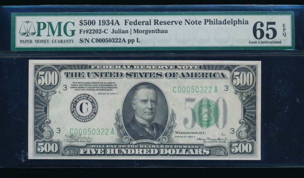 One 1934A $500 Philadelphia Federal Reserve Note PMG 65EPQ.