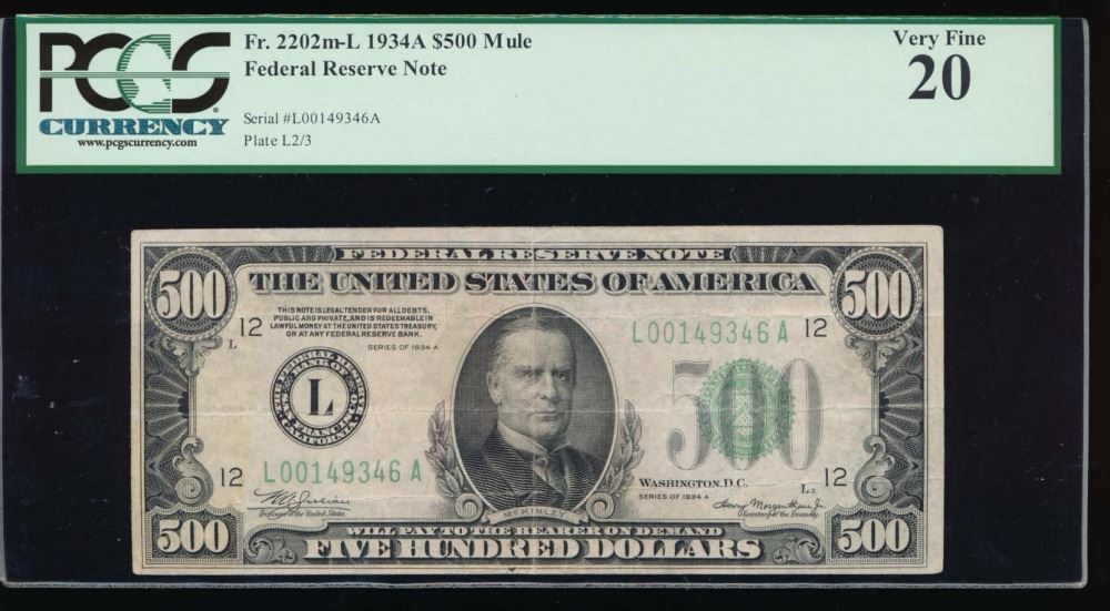 One 1934A $500 San Francisco Federal Reserve Note PCGS 20.