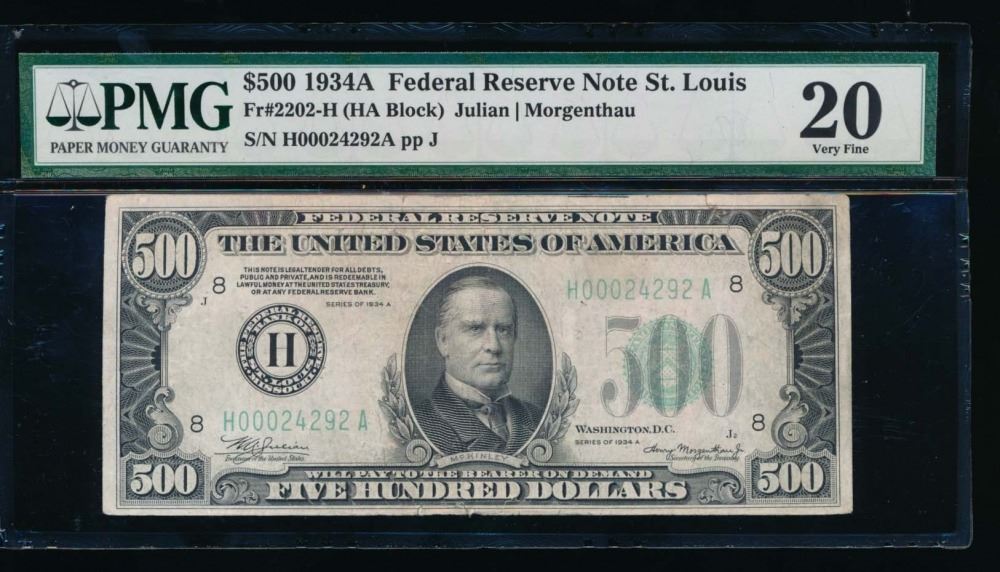 One 1934A $500 St Louis Federal Reserve Note PMG 20.