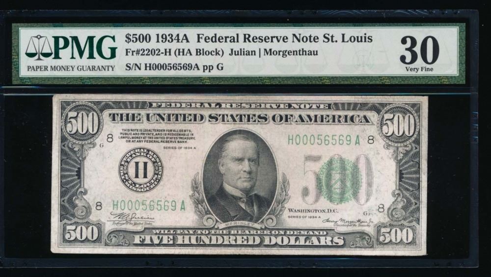 One 1934A $500 St Louis Federal Reserve Note PMG 30.