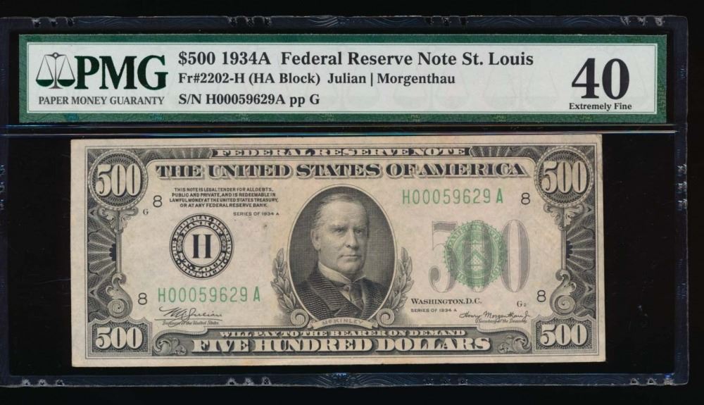 One 1934A $500 St. Louis Federal Reserve Note PMG 40.