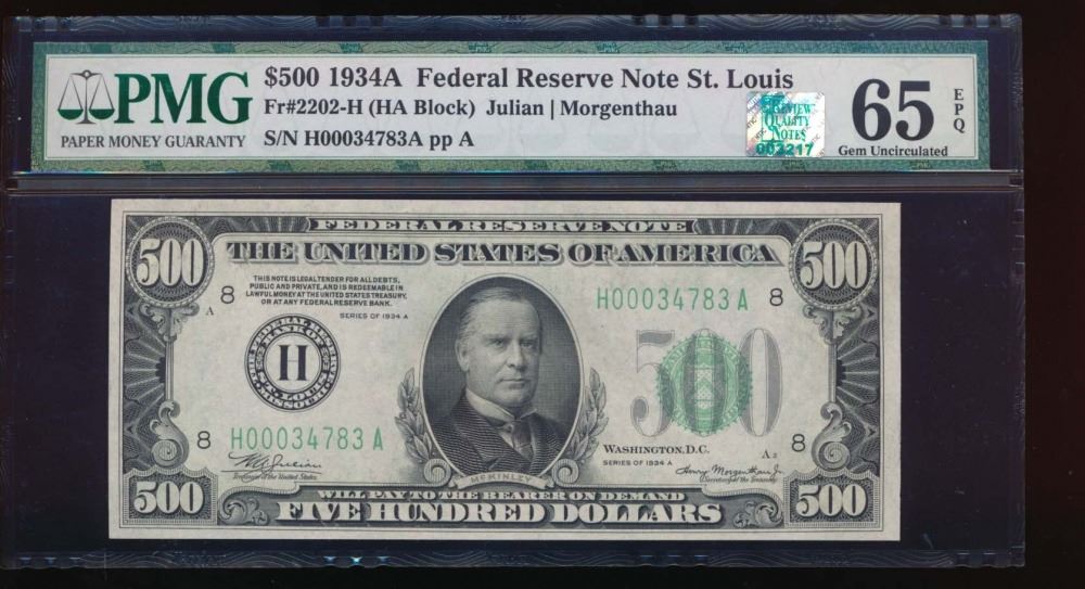 One 1934A $500 St Louis Federal Reserve Note PMG 65EPQ.