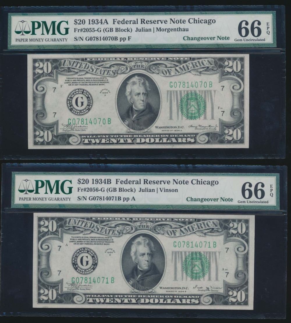 One 1934A and 1934B $20 Chicago Federal Reserve Notes PMG 66EPQ.