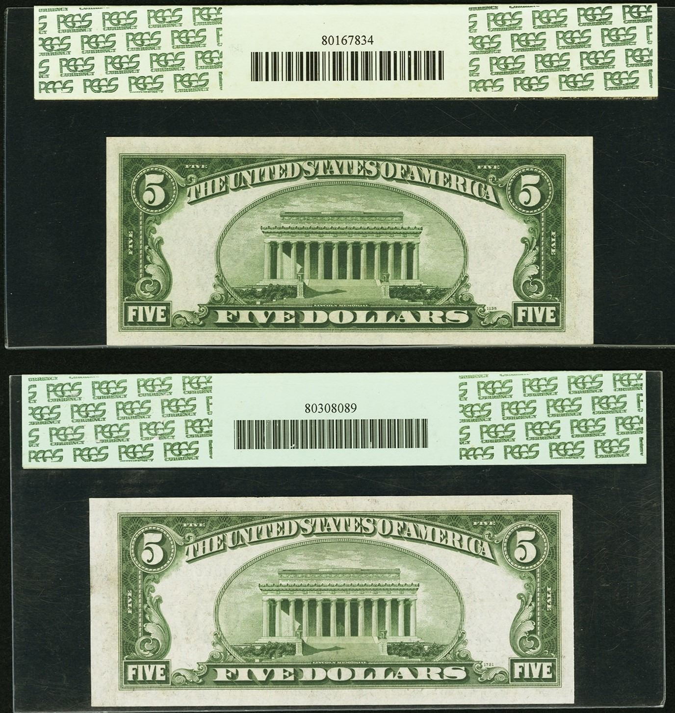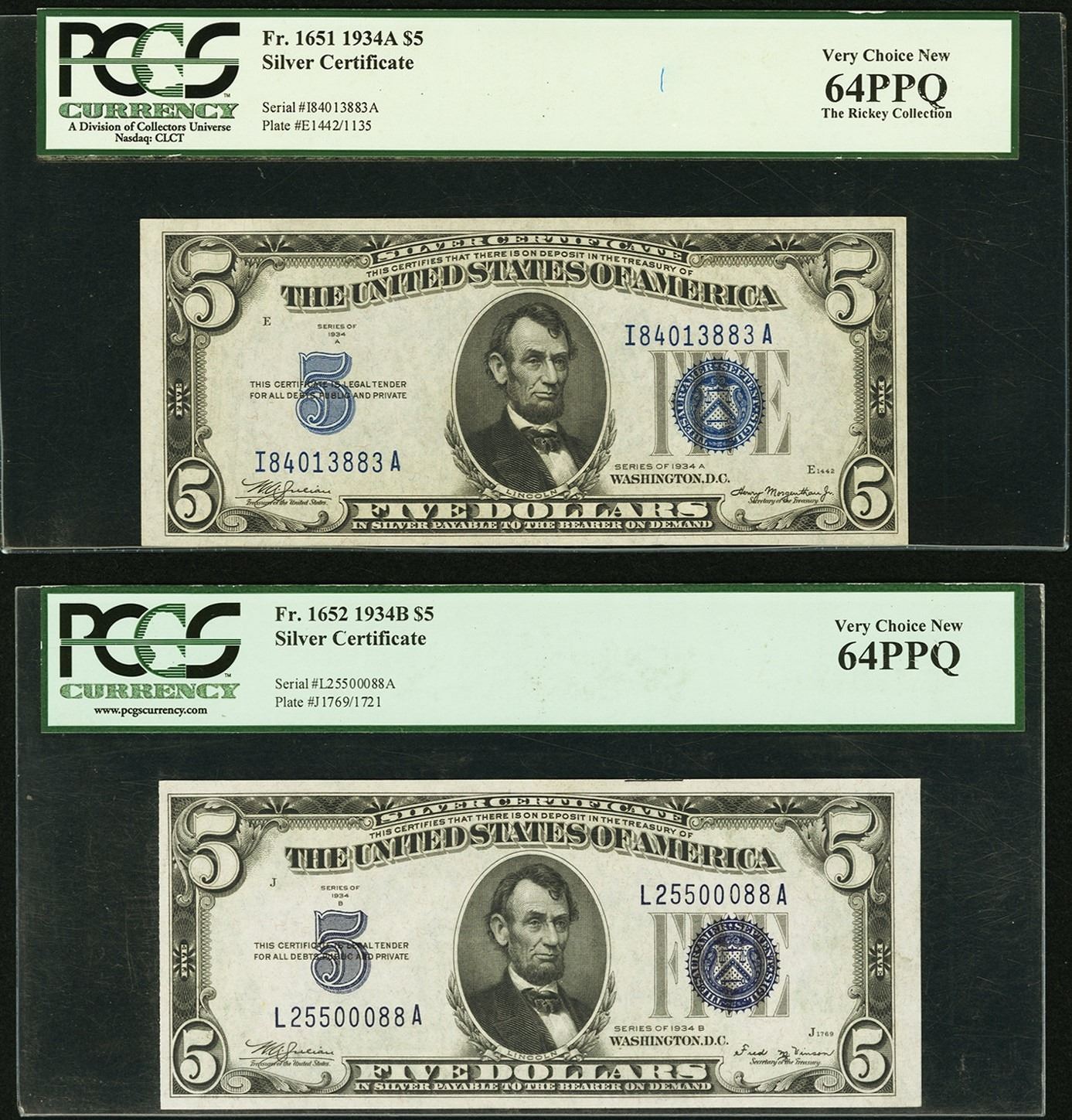 One 1934A and 1934B $5 Silver Certificates PCGS 64PPQ.