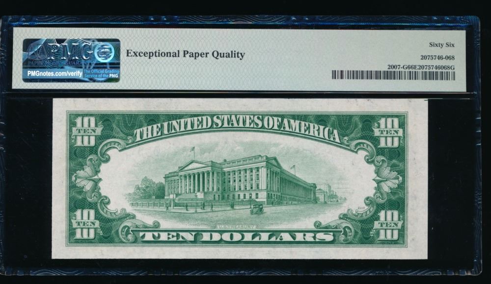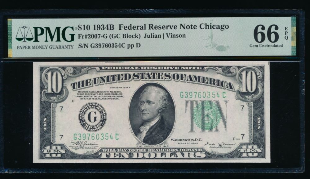 One 1934B $10 Chicago FRN PMG 66EPQ.