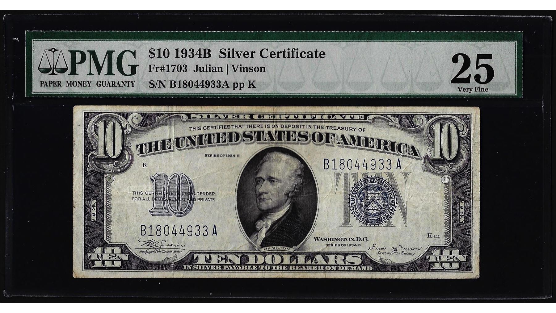 One 1934B $10 Silver Certificate Note Fr.1703 PMG Very Fine 25. PMG Certified.