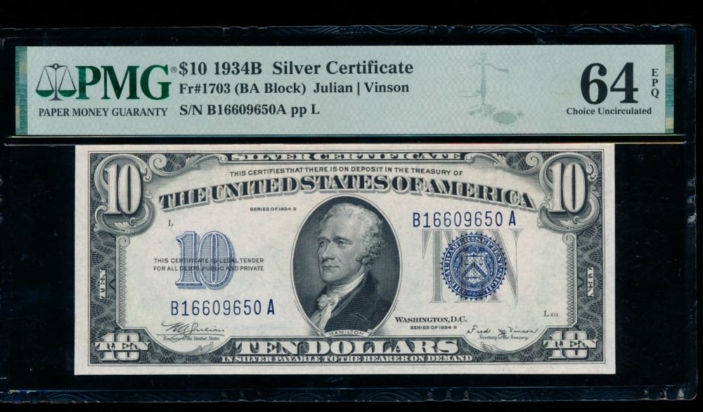 1934B $10 Silver Certificate PMG 64EPQ