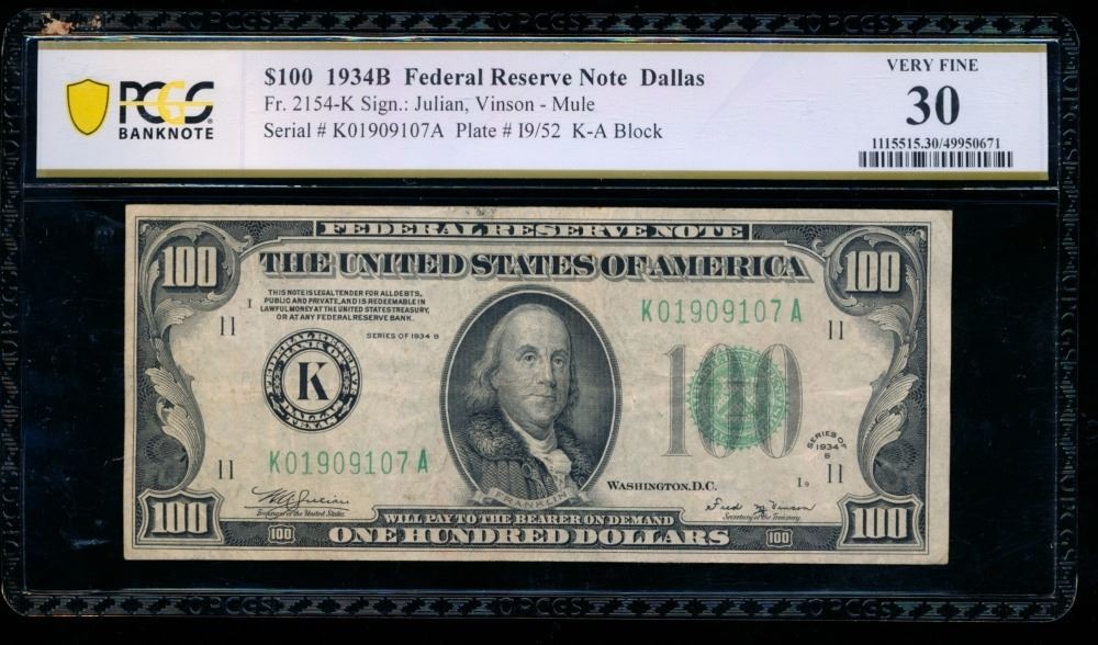 One 1934B $100 Dallas FRN PCGS 30.