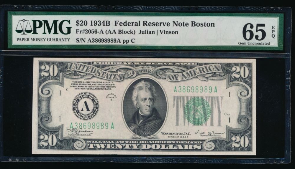 One 1934B $20 Boston FRN PMG 65EPQ.