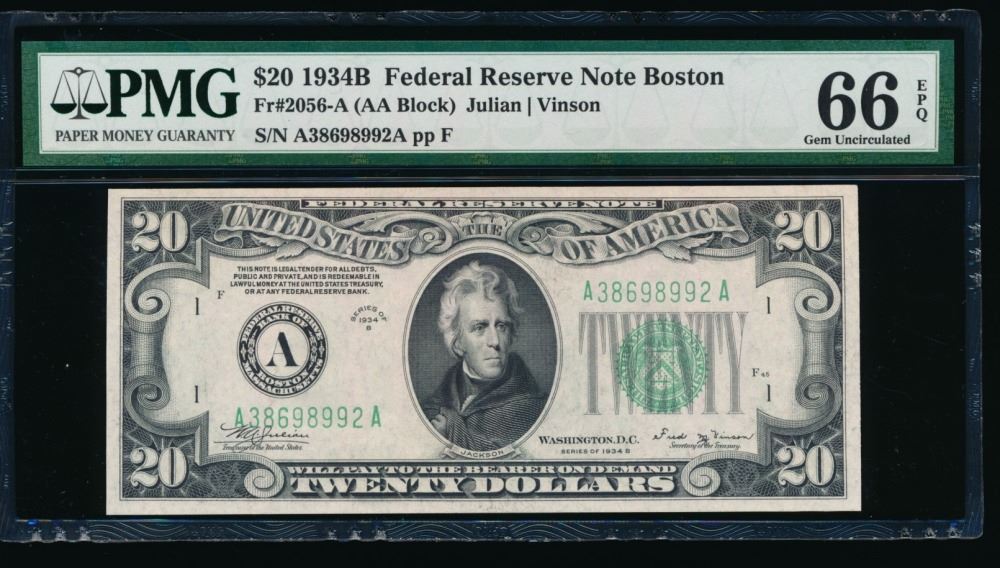 One 1934B $20 Boston FRN PMG 66EPQ.