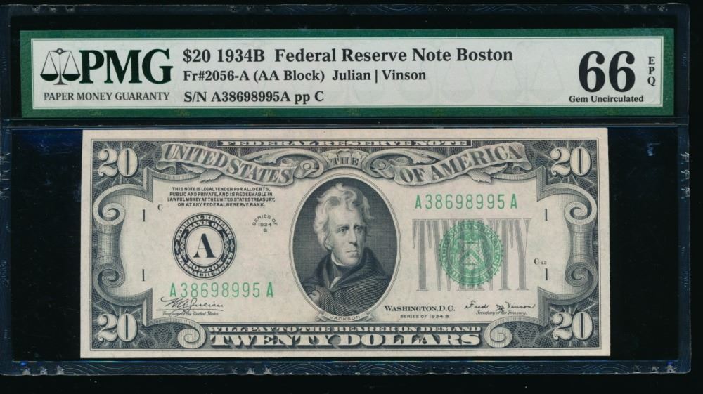 One 1934B $20 Boston FRN PMG 66EPQ.