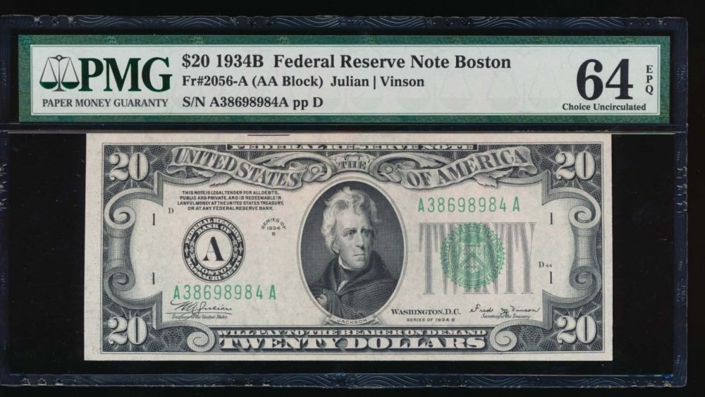 One 1934B $20 Boston Federal Reserve Note PMG 64EPQ.