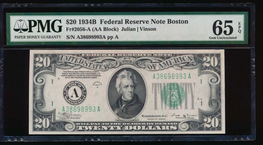 One 1934B $20 Boston Federal Reserve Note PMG 65EPQ.