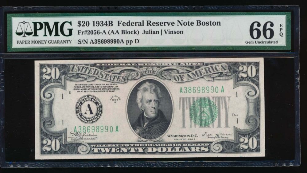 One 1934B $20 Boston Federal Reserve Note PMG 66EPQ.