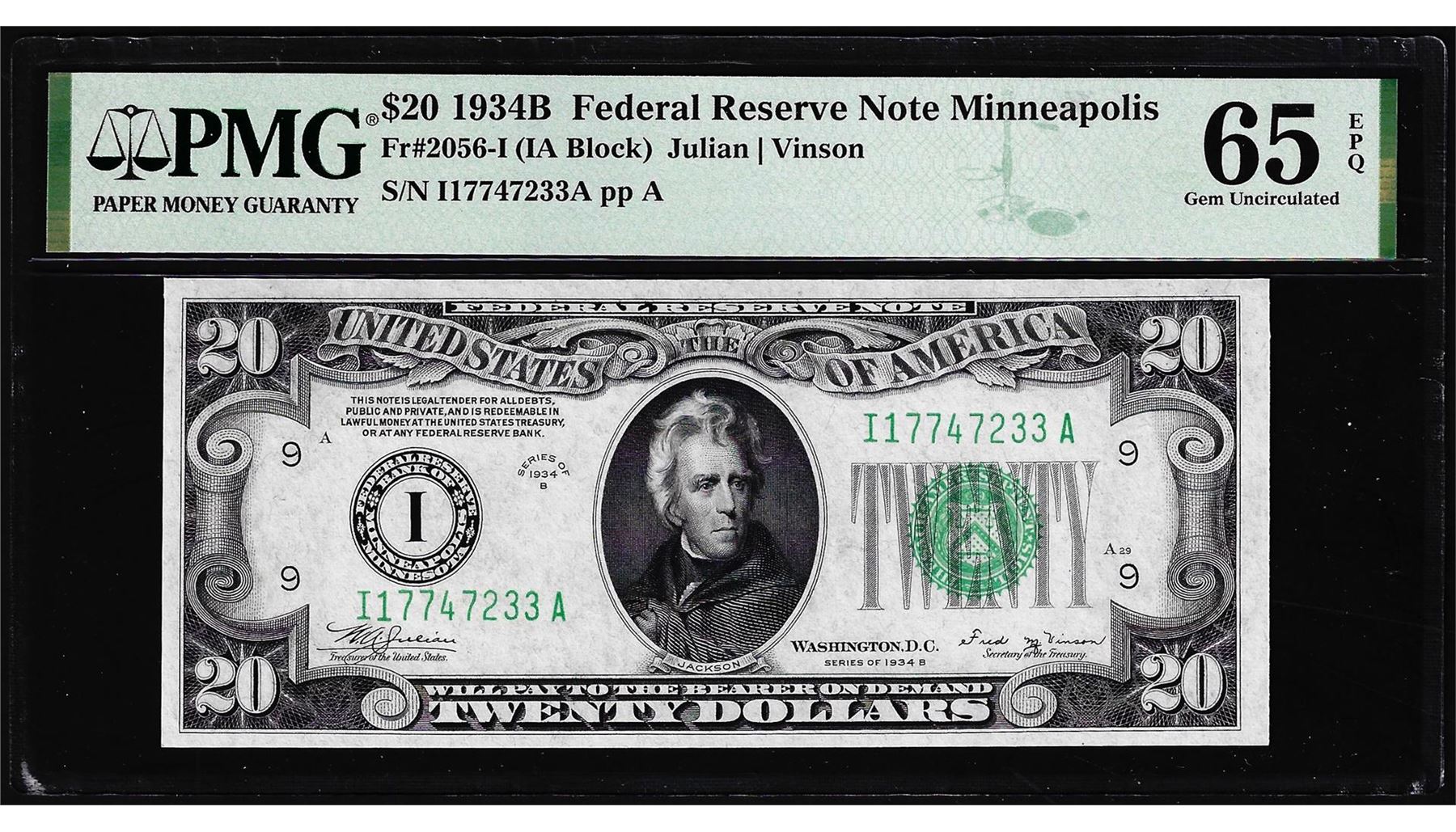 One 1934B $20 Federal Reserve Note Minneapolis Fr.2056-I PMG Gem Uncirculated 65EPQ. PMG Certified.