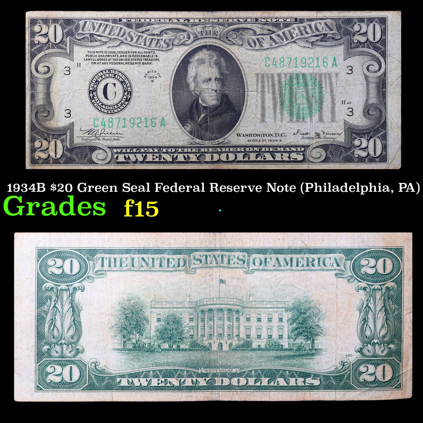 1934B $20 Green Seal Federal Reserve Note (Philadelphia, PA) Grades f+