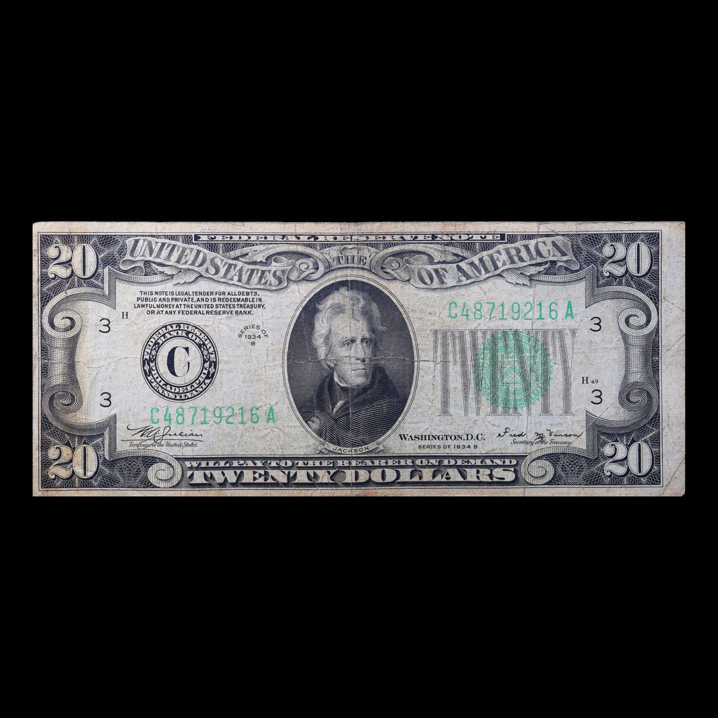 1934B $20 Green Seal Federal Reserve Note (Philadelphia, PA) Grades f+.
