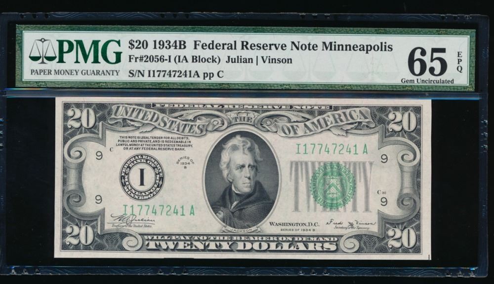One 1934B $20 Minneapolis Federal Reserve Note PMG 65EPQ.