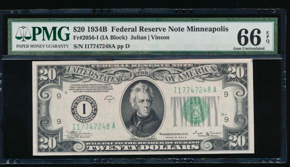 One 1934B $20 Minneapolis Federal Reserve Note PMG 66EPQ.