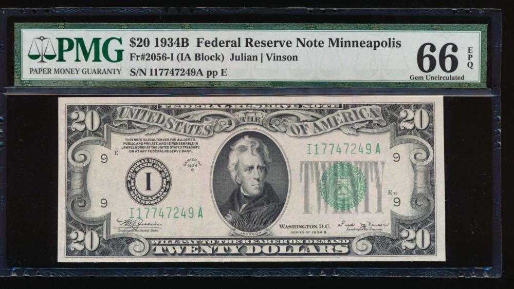 One 1934B $20 Minneapolis Federal Reserve Note PMG 66EPQ.