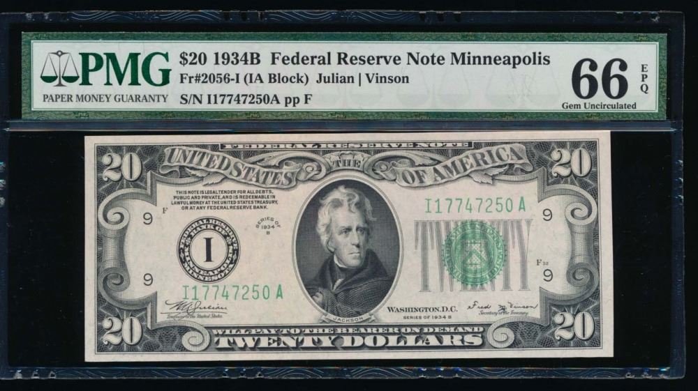One 1934B $20 Minneapolis Federal Reserve Note PMG 66EPQ.