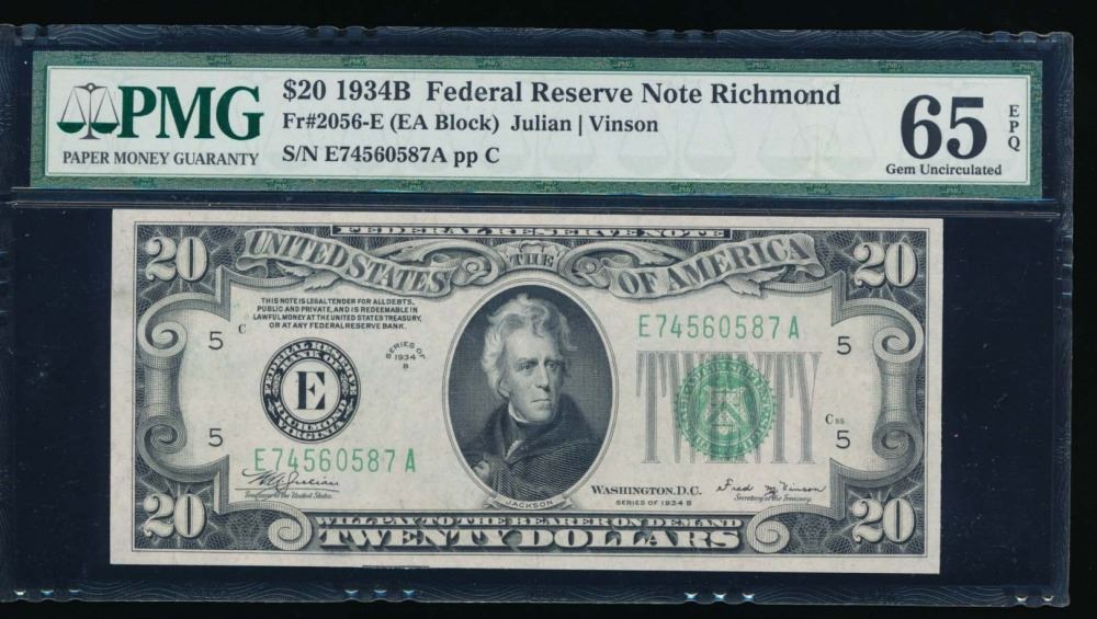 One 1934B $20 Richmond Federal Reserve Note PMG 65EPQ.
