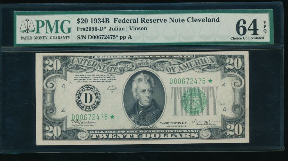 One 1934B $20 STAR Cleveland FRN PMG 64EPQ.
