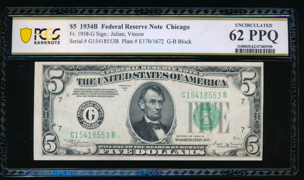 One 1934B $5 Chicago FRN PCGS 62PPQ.