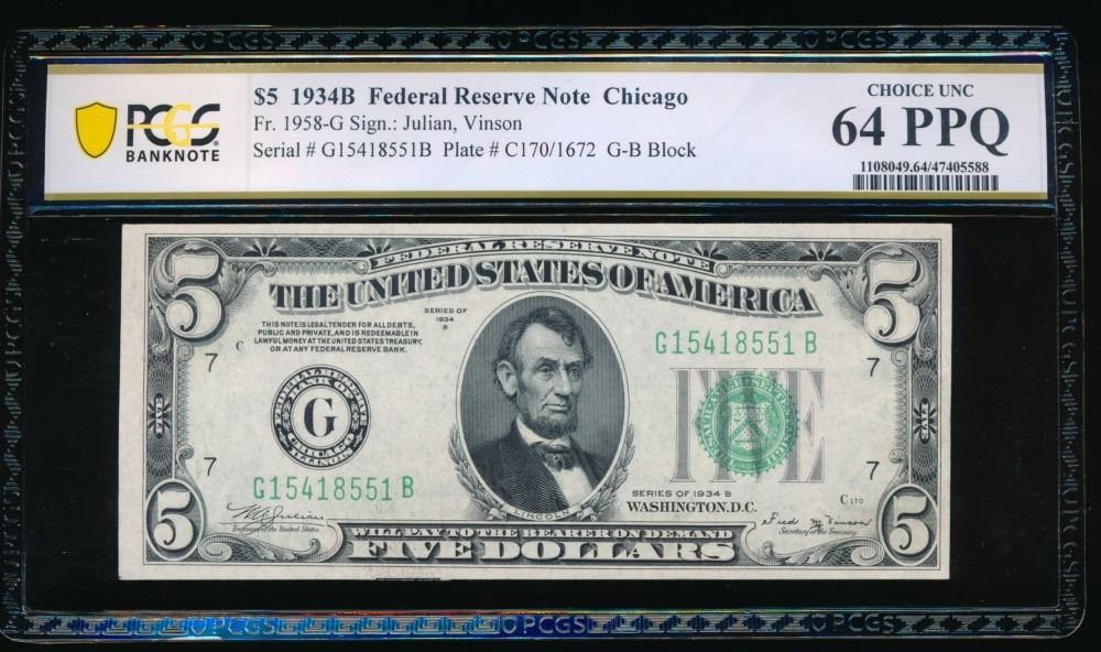 One 1934B $5 Chicago FRN PCGS 64PPQ.
