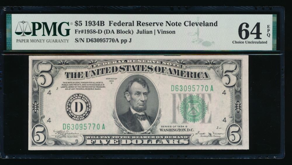 One 1934B $5 Cleveland Federal Reserve Note PMG 64EPQ.