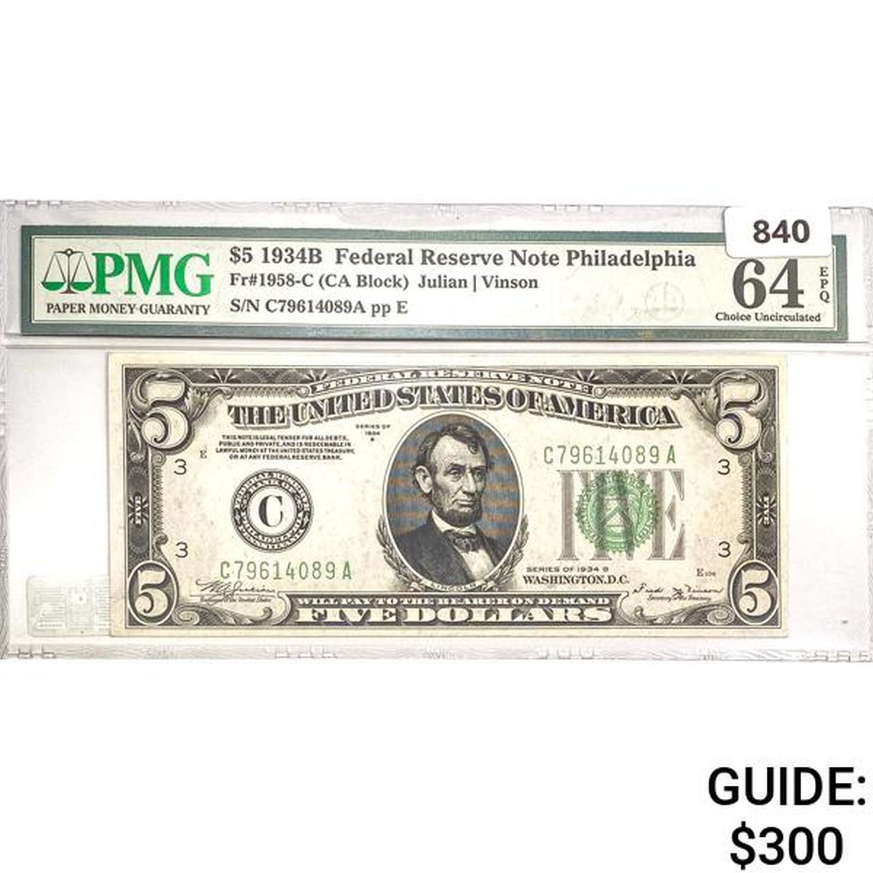 1934B $5 Fed Reserve Note PMG Ch UNC 64