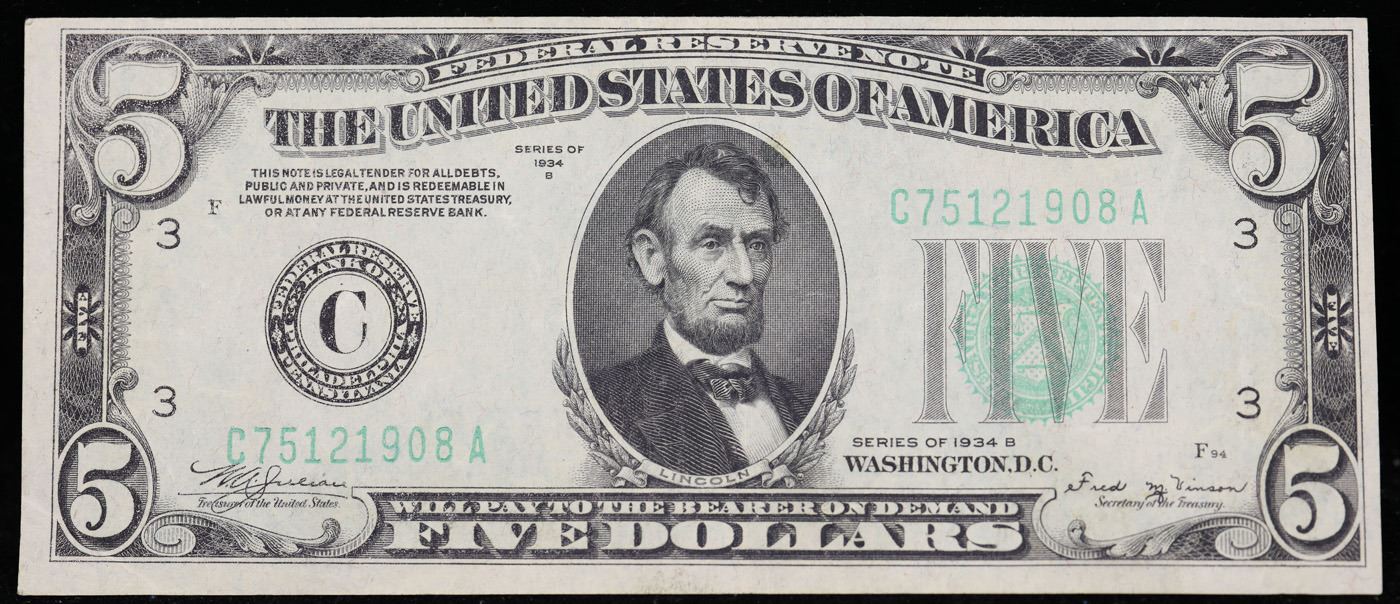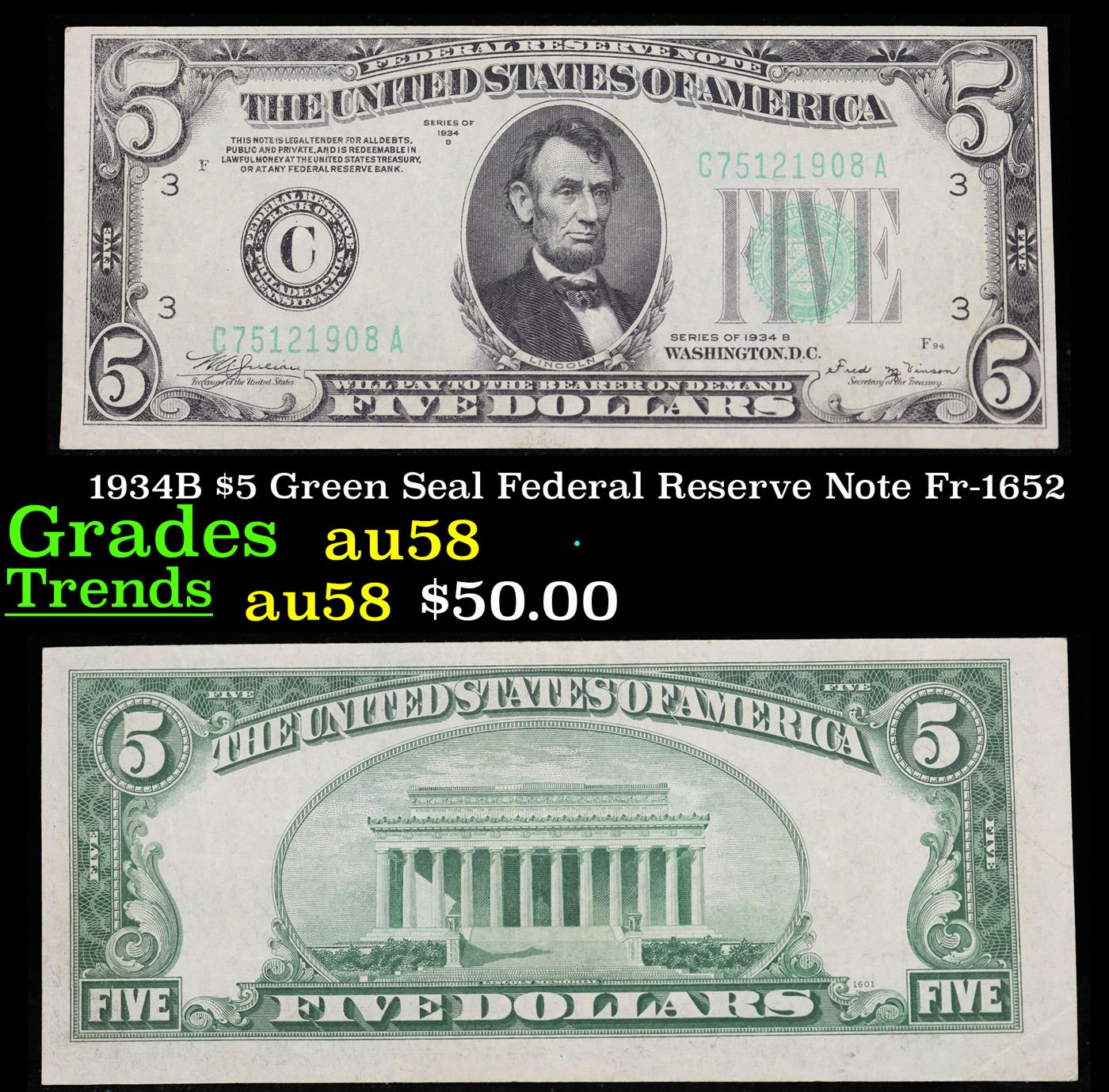 1934B $5 Green Seal Federal Reserve Note Fr-1652 Grades Choice AU/BU Slider.