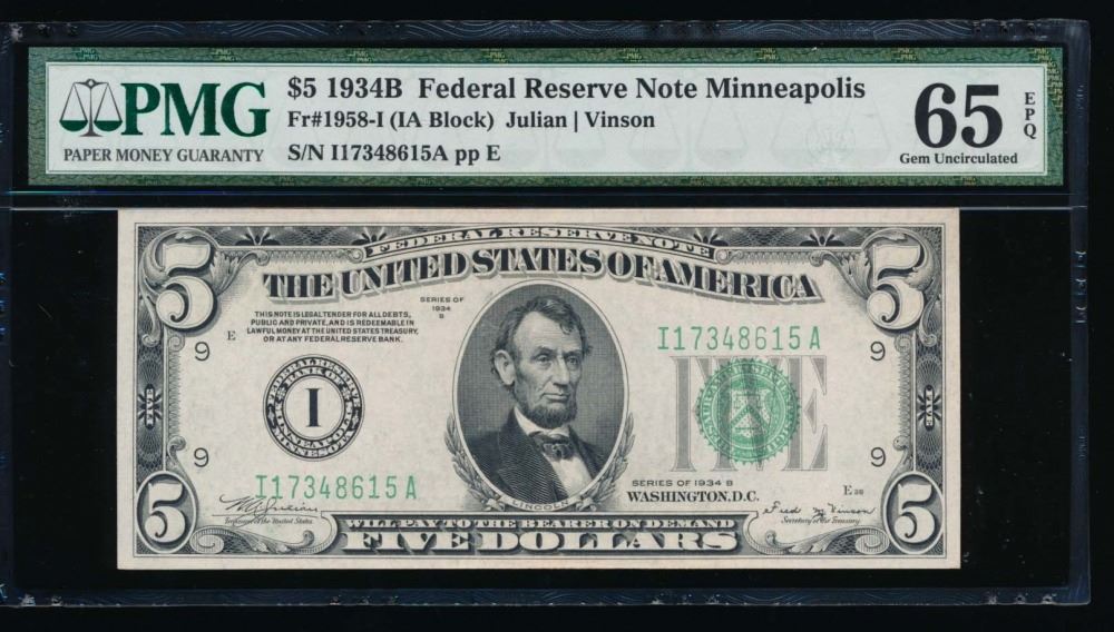 One 1934B $5 Minneapolis Federal Reserve Note PMG 65EPQ.
