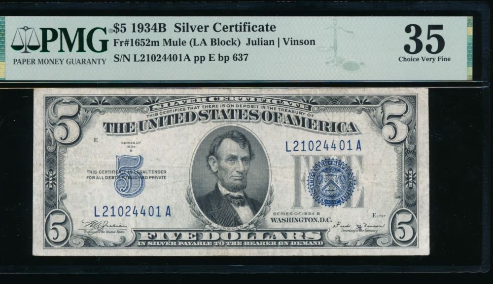 One 1934B $5 Mule Silver Certificate PMG 35.
