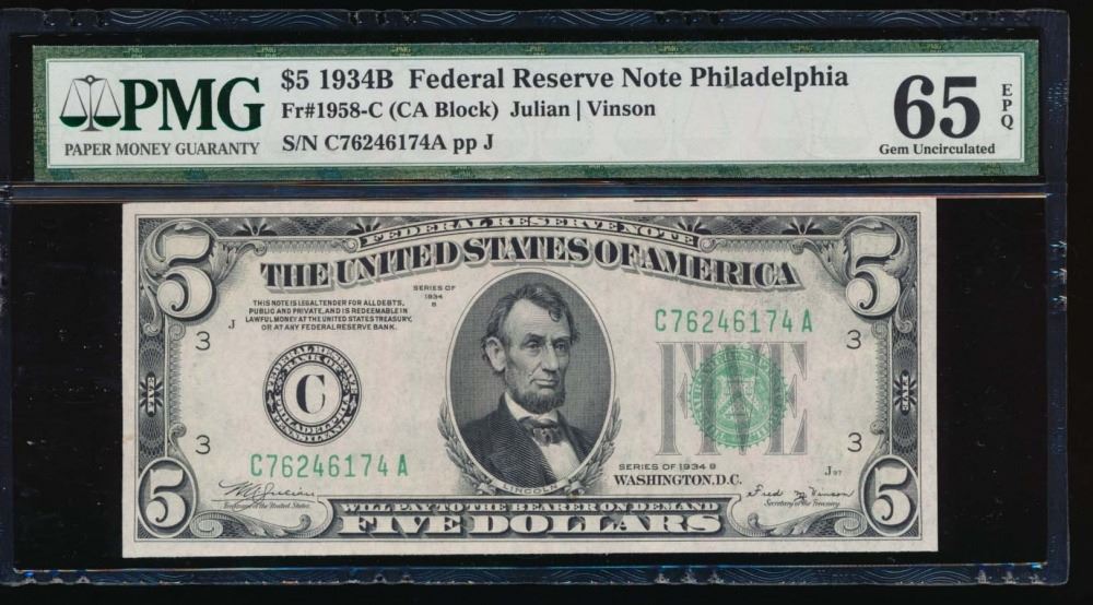 One 1934B $5 Philadelphia Federal Reserve Note PMG 65EPQ.