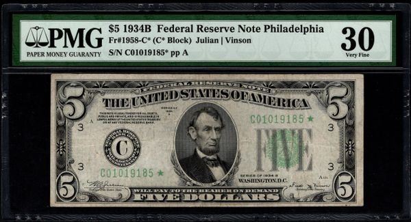 One 1934B $5 STAR Philadelphia FRN PMG 30.