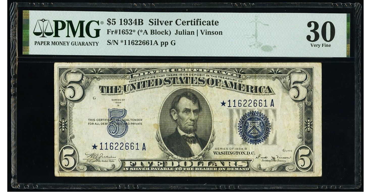 One 1934B $5 STAR Silver Certificate PMG 30.