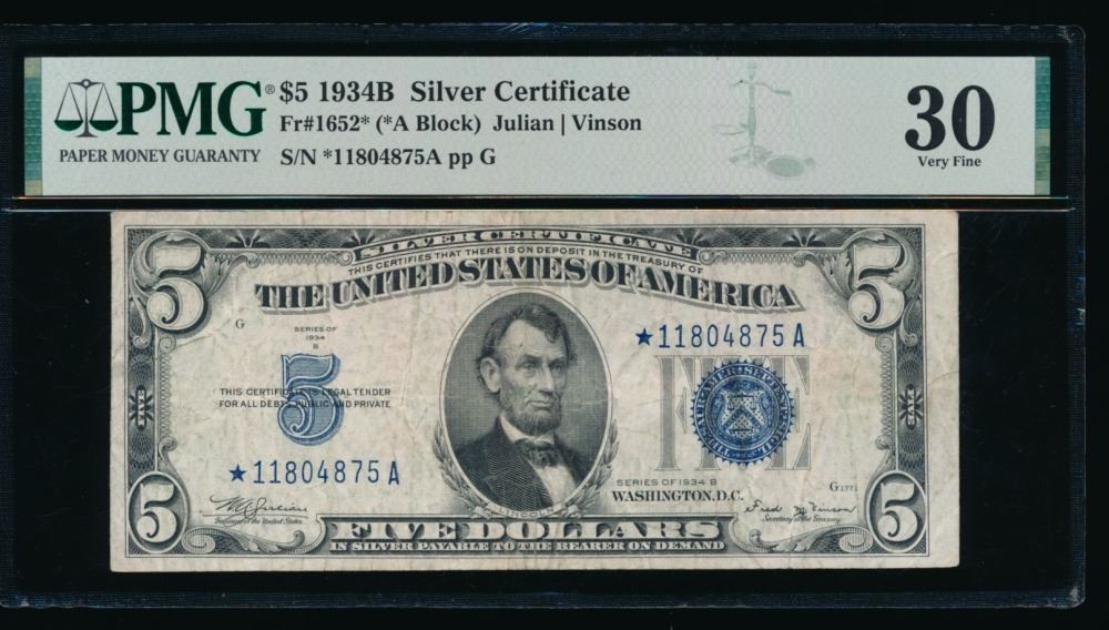 One 1934B $5 STAR Silver Certificate PMG 30.