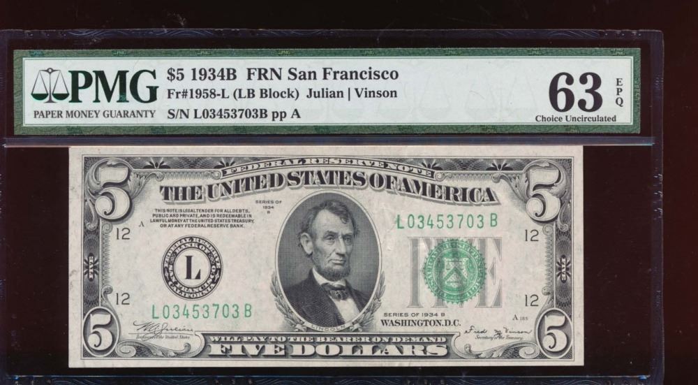 One 1934B $5 San Francisco Federal Reserve Note PMG 63EPQ.