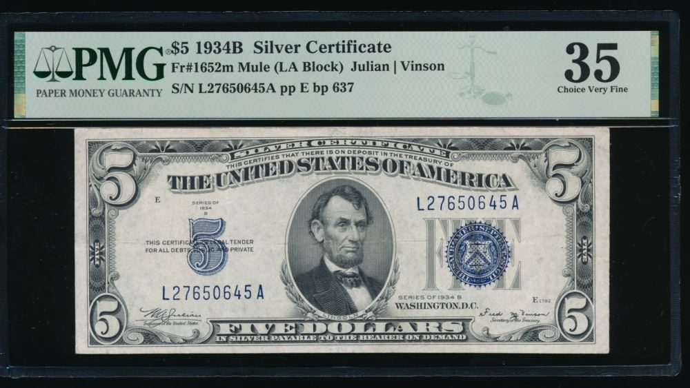 One 1934B $5 Silver Certificate PMG 35.