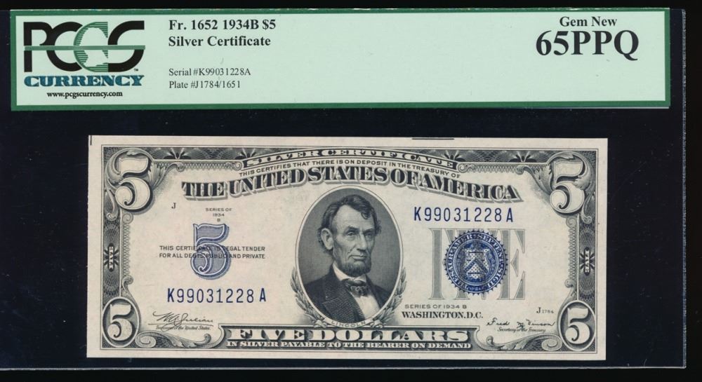 One 1934B $5 Silver Certificate PMG 65EPQ.