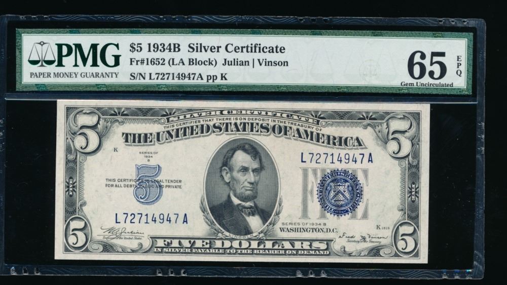 One 1934B $5 Silver Certificate PMG 65EPQ.