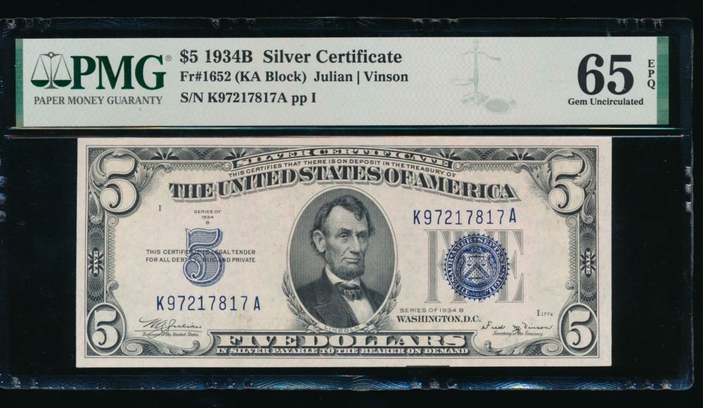 One 1934B $5 Silver Certificate PMG 65EPQ.