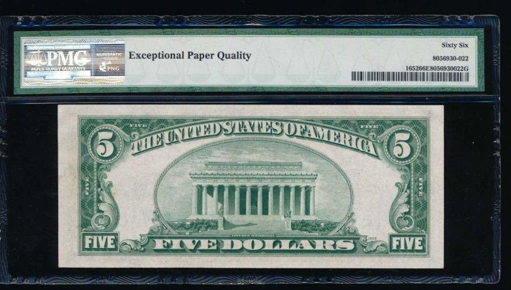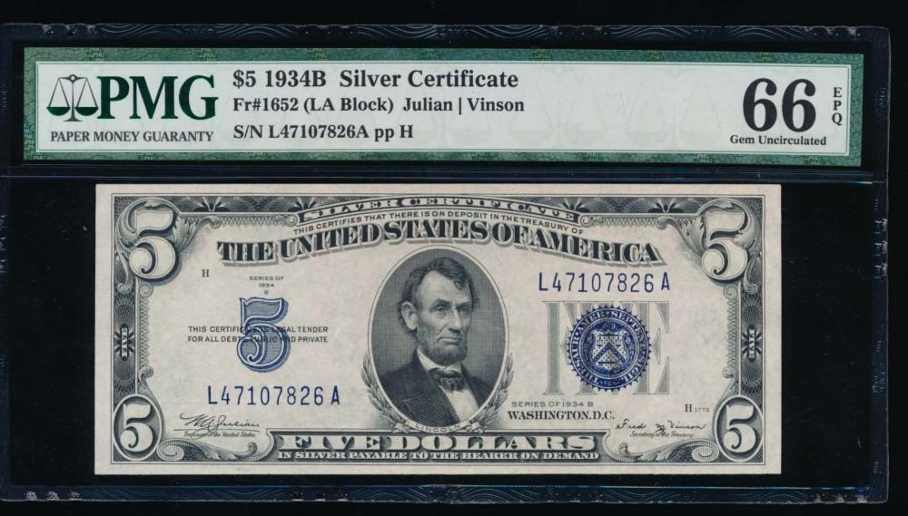 One 1934B $5 Silver Certificate PMG 66EPQ.