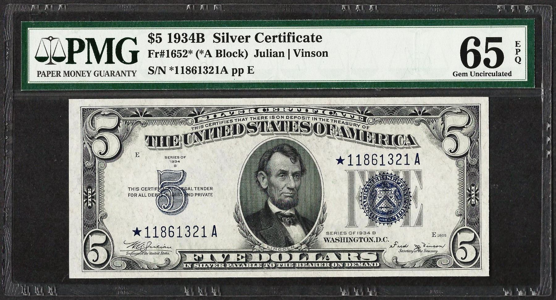 One 1934B $5 Silver Certificate STAR Note Fr.1652* PMG Gem Uncirculated 65EPQ.