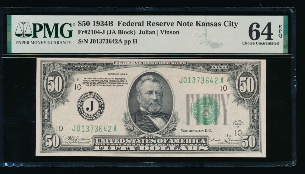 One 1934B $50 Kansas City FRN PMG 64EPQ.