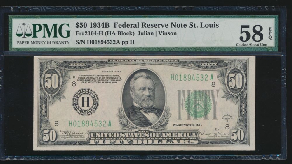 One 1934B $50 St Louis Federal Reserve Note PMG 58EPQ.