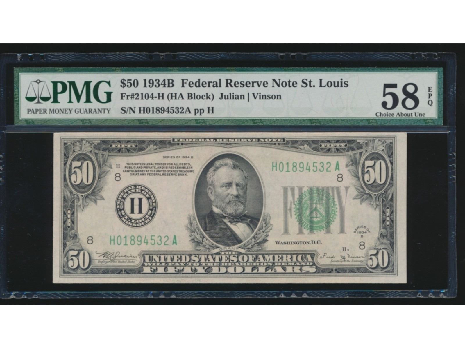One 1934B $50 St Louis Federal Reserve Note PMG 58EPQ.