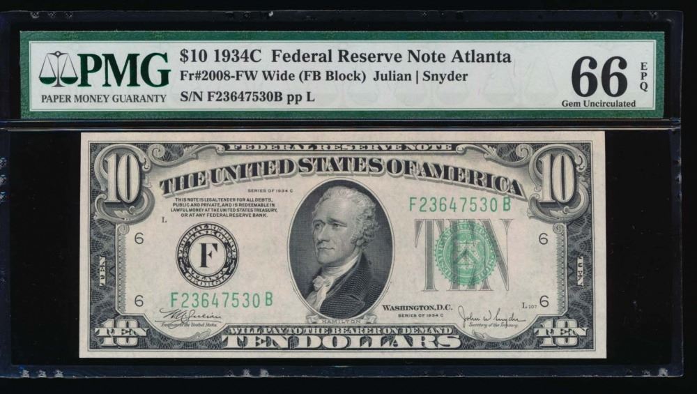 One 1934C $10 Atlanta Federal Reserve Note PMG 66EPQ.