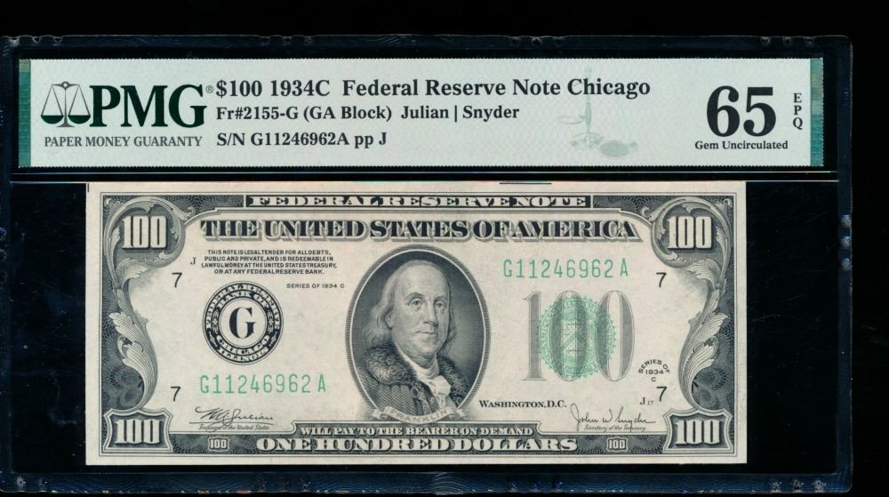 One 1934C $10 Chicago FRN PMG 65EPQ.